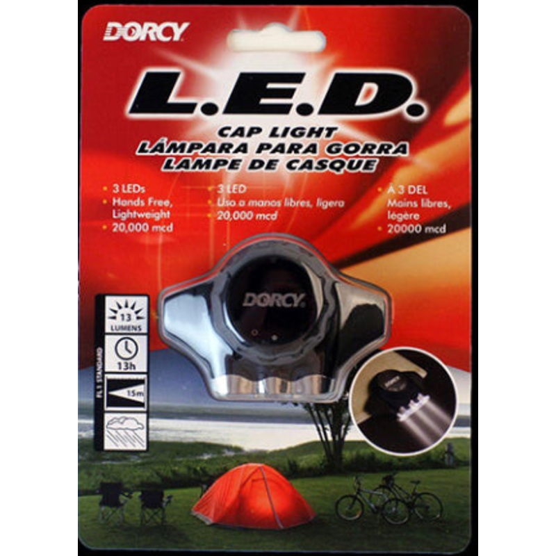 5 mm cap light features 3 super bright white LEDs. Convenient clip attachment that allows the user to wear on the brim of a hat for hands free use. Bottom mounted slide switch for convenience. Includes batteries.