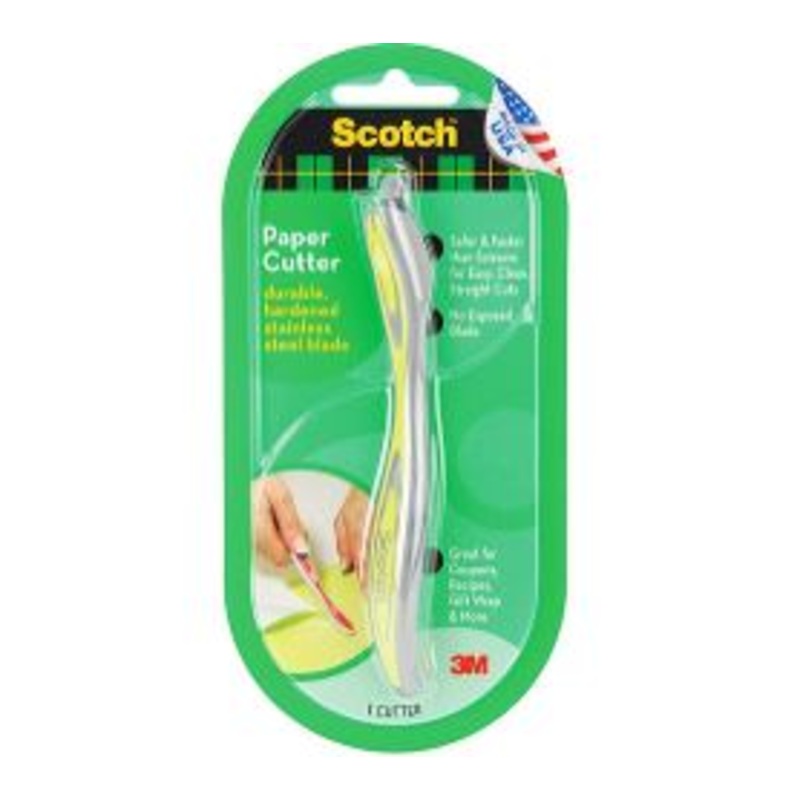 Faster than scissors for clean, straight cuts, the Scotch paper cutter easily glides through most materials with a simple forward motion. With its protected blade, the paper cutter gives you the freedom to cut without the fear of being nicked by a sharp object. Plus, the contoured, rubberized handle provides a comfortable grip, so your hand won’t slip when cutting materials.