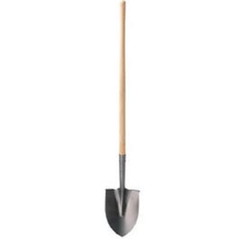 Basic shovel with round-point blade and long, lacquered handle.